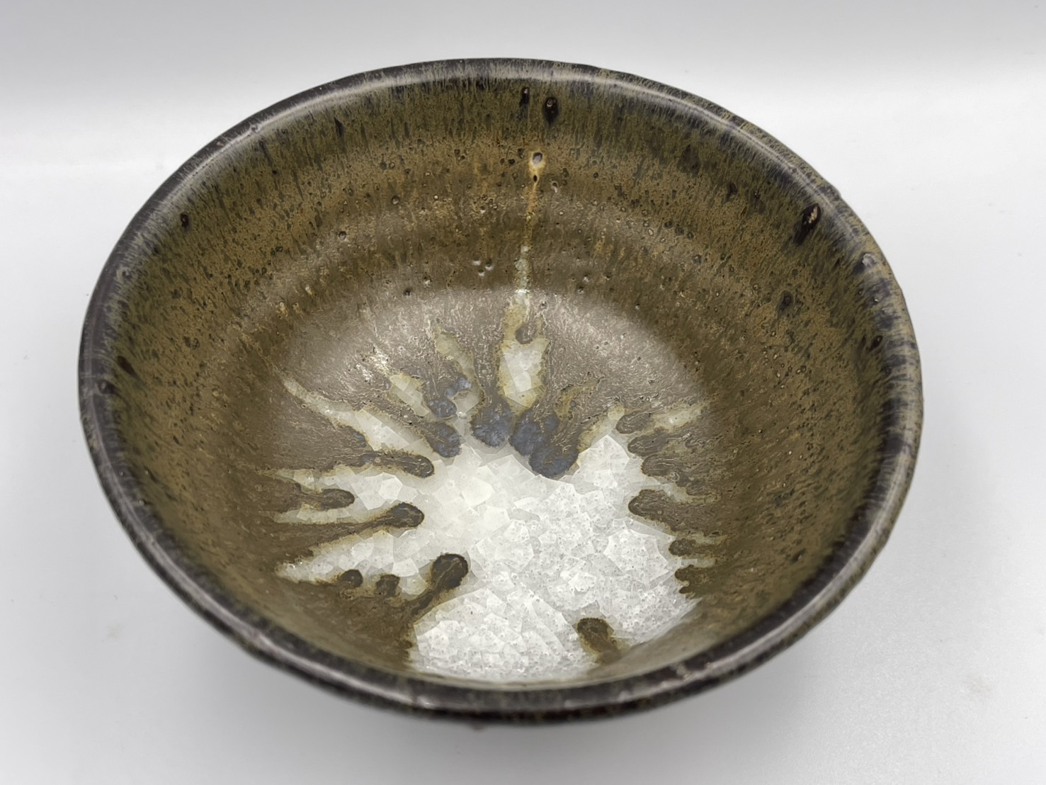 毫紋從碗心放射開來,像是有生命般向外延伸。釉面裂出冰紋,深淺交錯,褐色、青灰在光線下層次分明。釉面上的縮釉,露出底下的胎土,像是水墨畫裡的飛白,讓整個節奏鬆了下來。