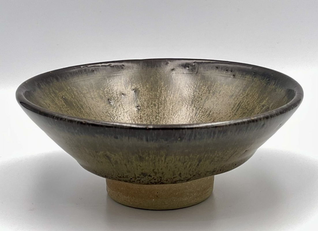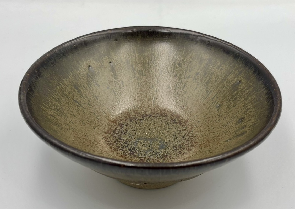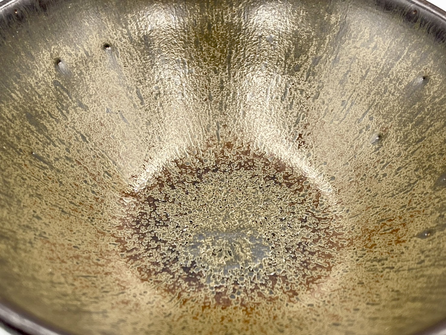 施的是兔毫釉,金褐色的絲紋從盌心散開,細密綿長。盌底聚集了更深的褐色斑點,像是窯火停留最久的地方。釉色從米白漸變到金褐再到深褐,光線一動,整個盌就活了起來。口沿處保留了黑褐色的邊緣,襯得內裡的金色更加溫暖。