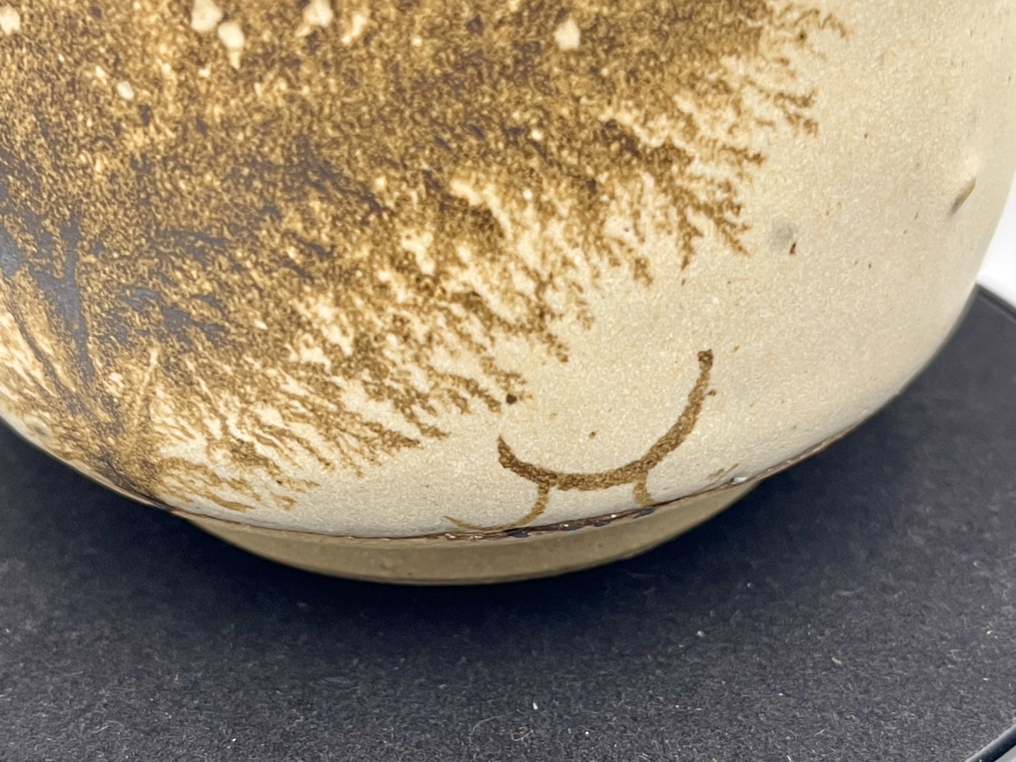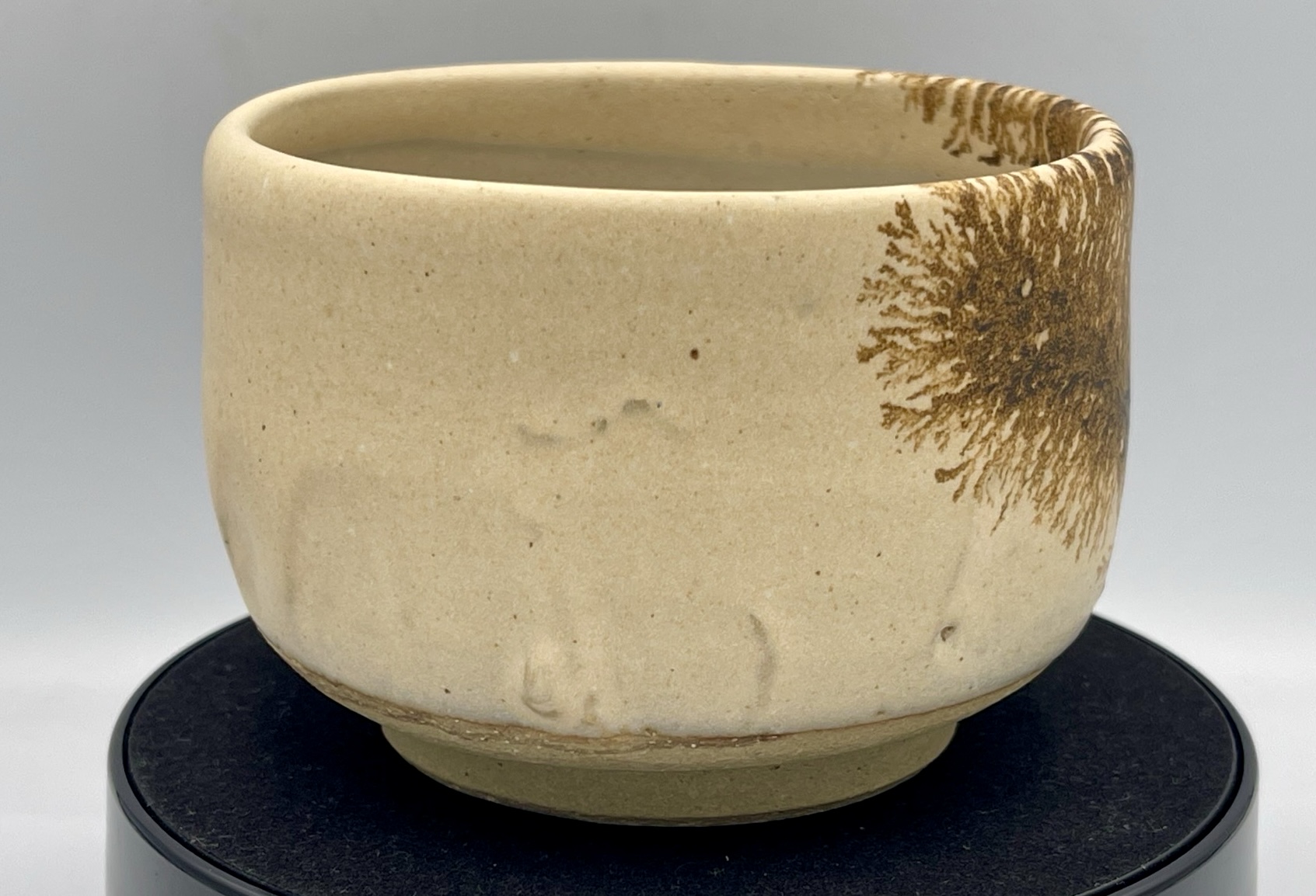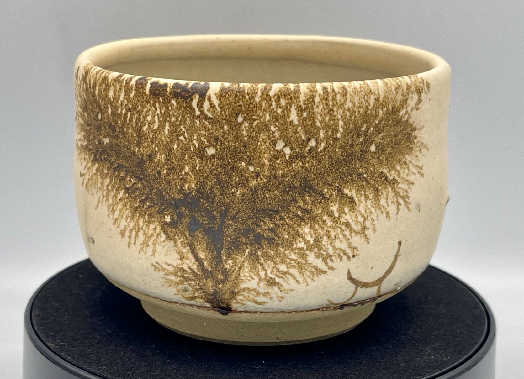 作者先使用底釉打底,再用氧化鐵成份的釉藥滴在其上,「摩卡擴散」之後再燒製,氧化鐵色澤會呈現紅到黑的變化,落羽松便出現了。而在土胚的成分上,一樣抱持著還給陶土本來面目的想法,在細陶土之內混入細石,營造出粗獷樸實的觸感。