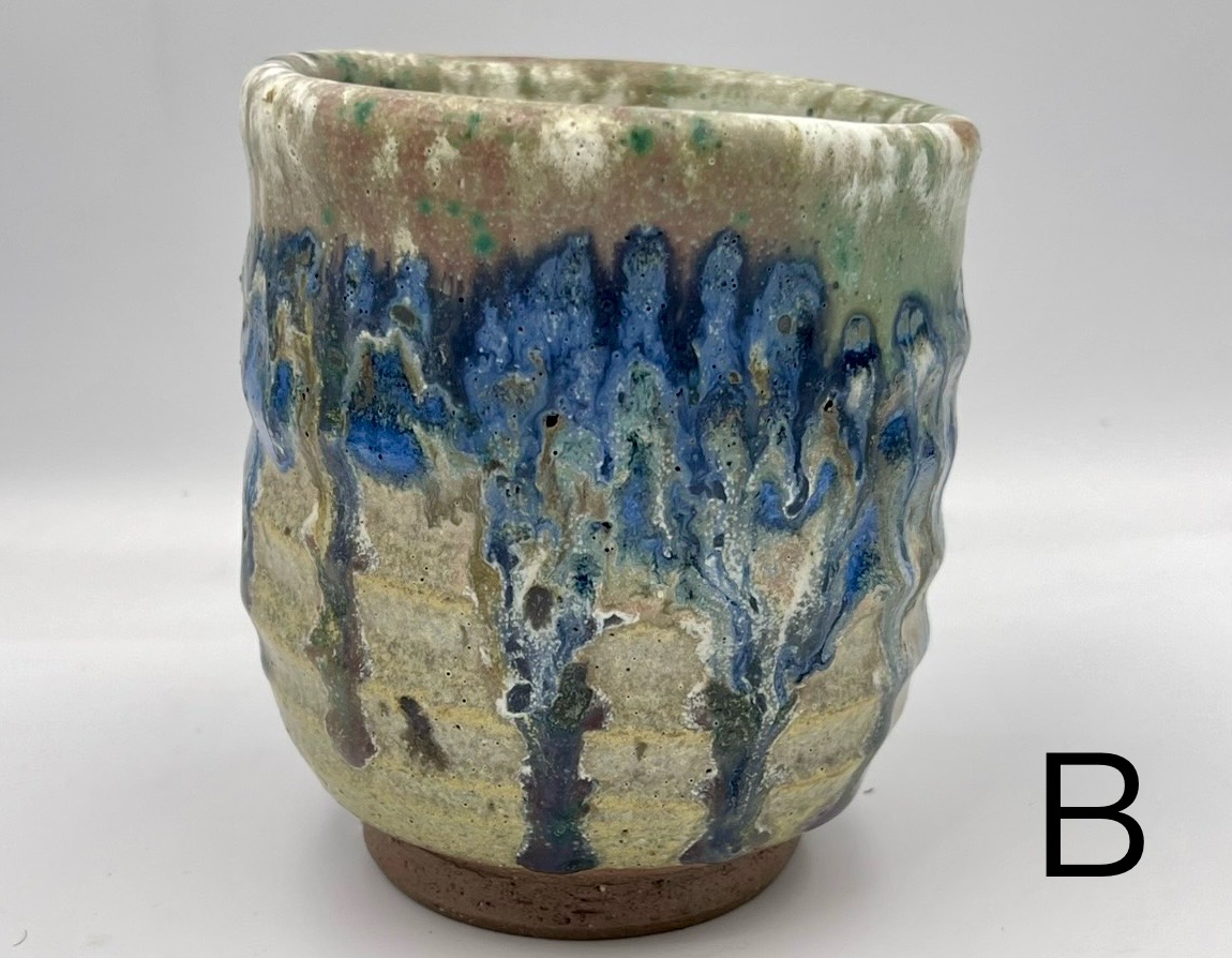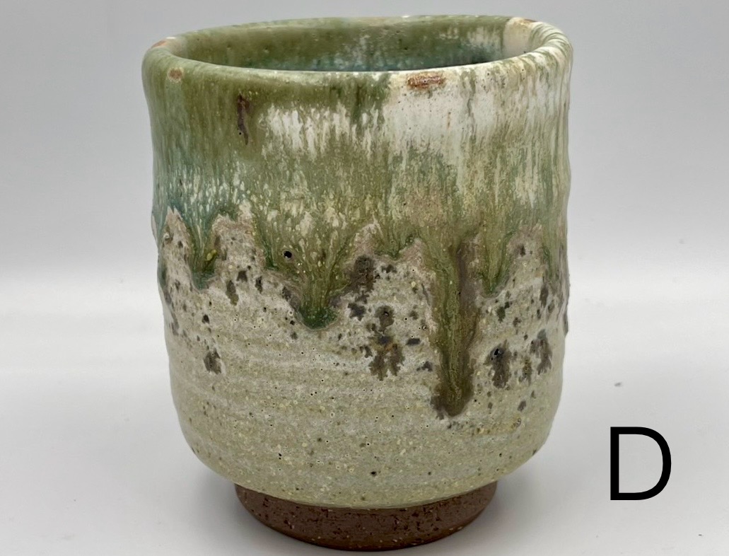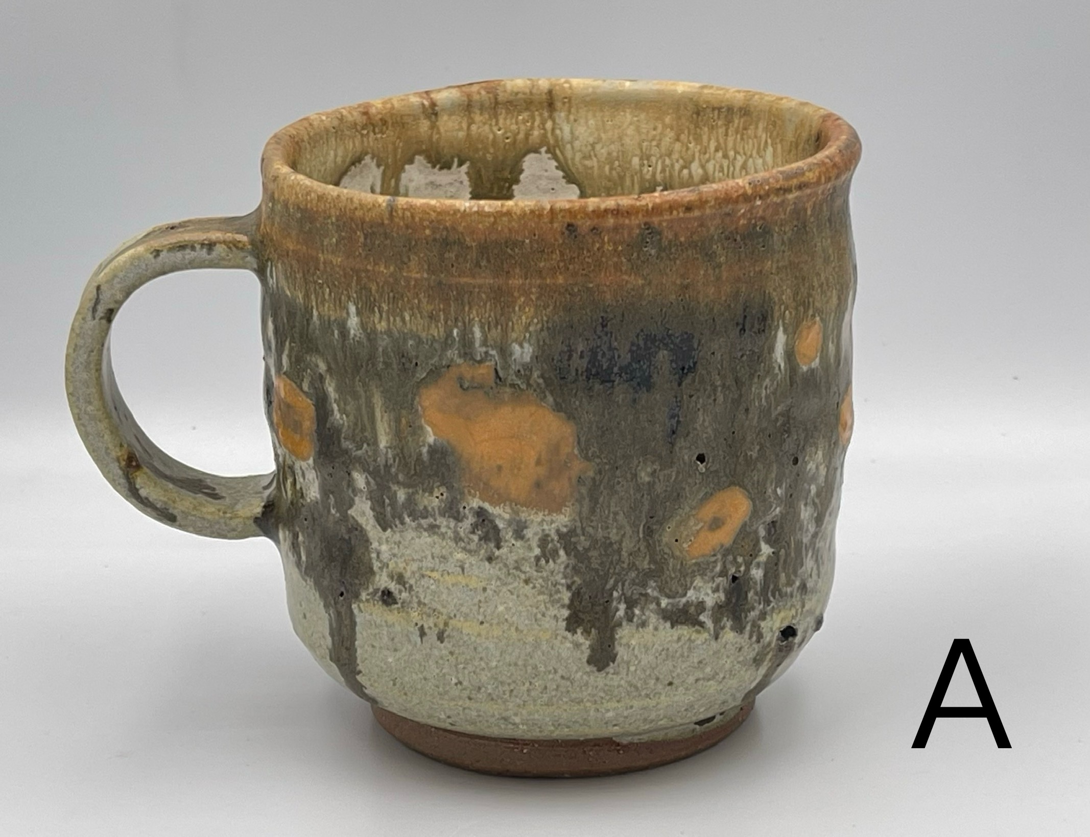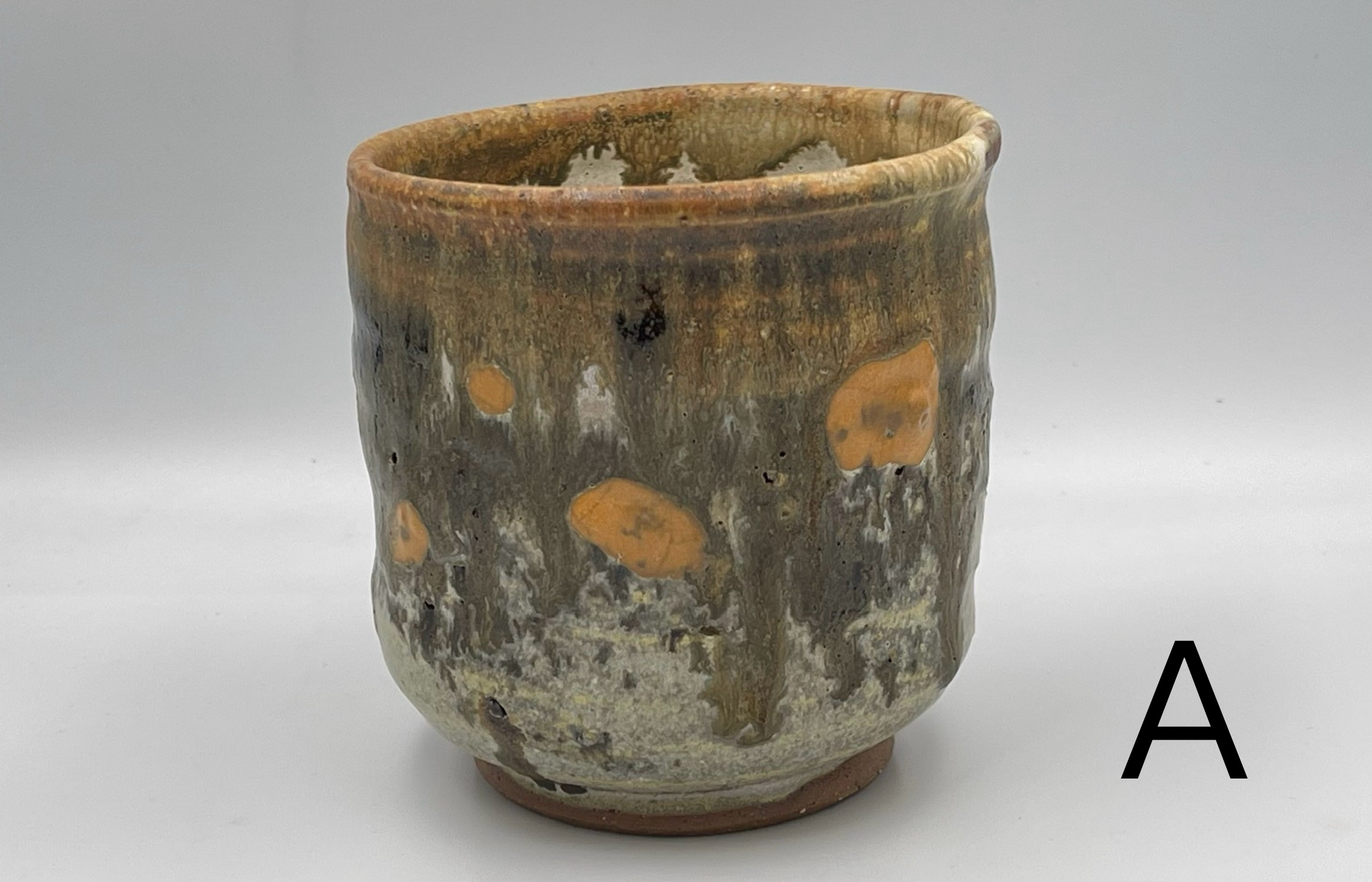 此杯以溪石為骨,岩礦為質,取自大漢溪河床的天然礫石研磨成泥,於窯中淬煉而成。釉色青灰相間,帶著橙褐斑點,像極了溪水沖刷過的卵石,沉穩溫潤,握在手中有種踏實的重量感。